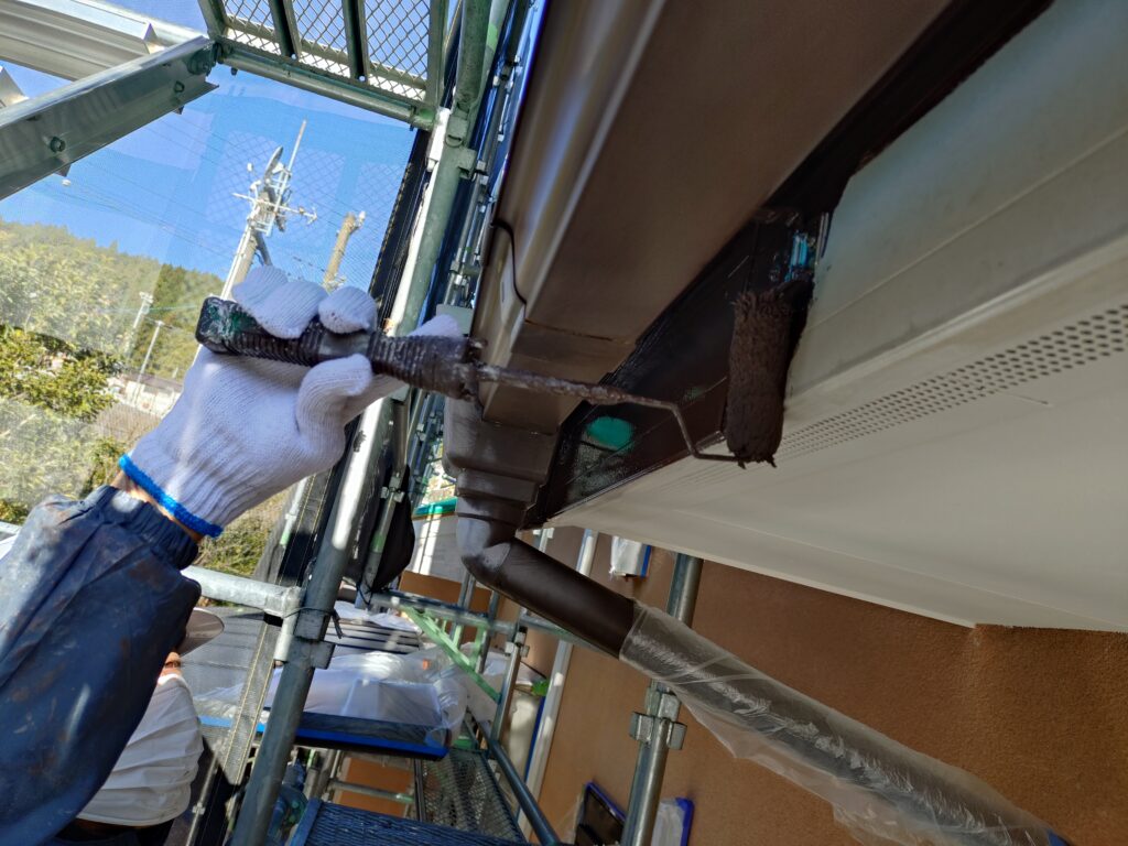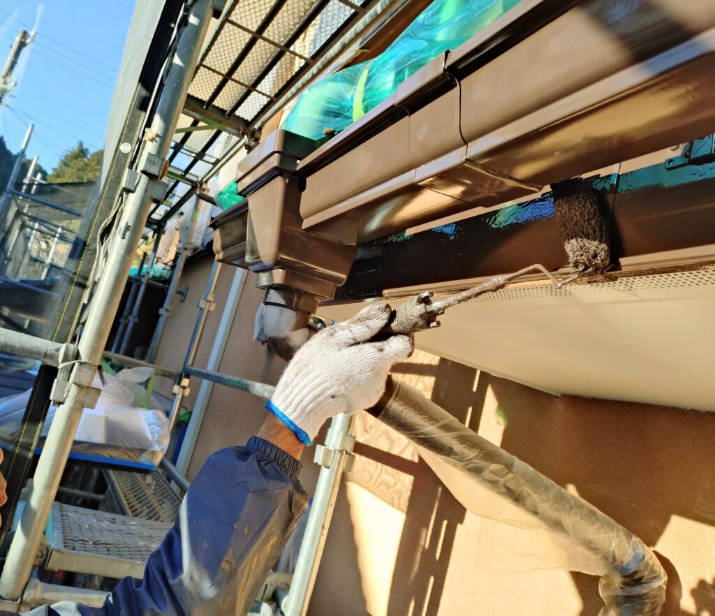 雨樋と鼻隠しを塗装するにあたり、塗装前は雨樋は茶色鼻隠しは白と統一感がなかったので二か所とも同じ茶色の艶有にそろえ統一感を出しました。