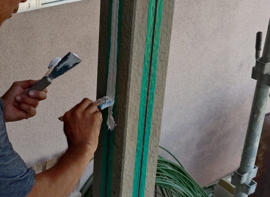 コーキング充填は、外から雨水が入らないようにするための大事な工程です。