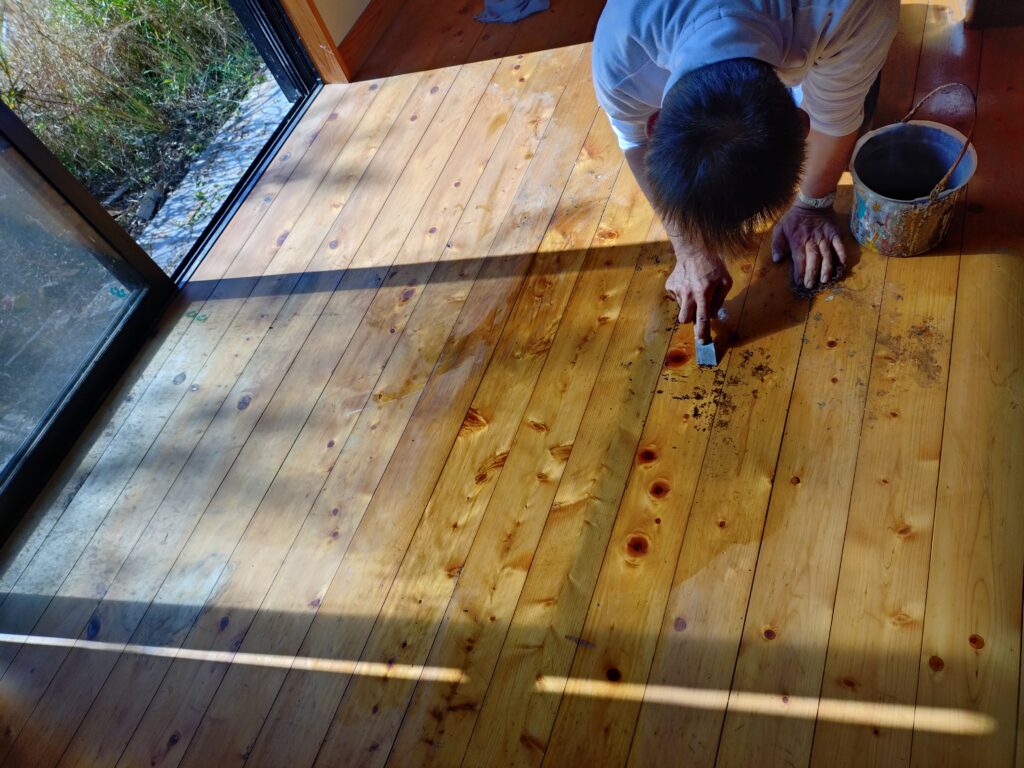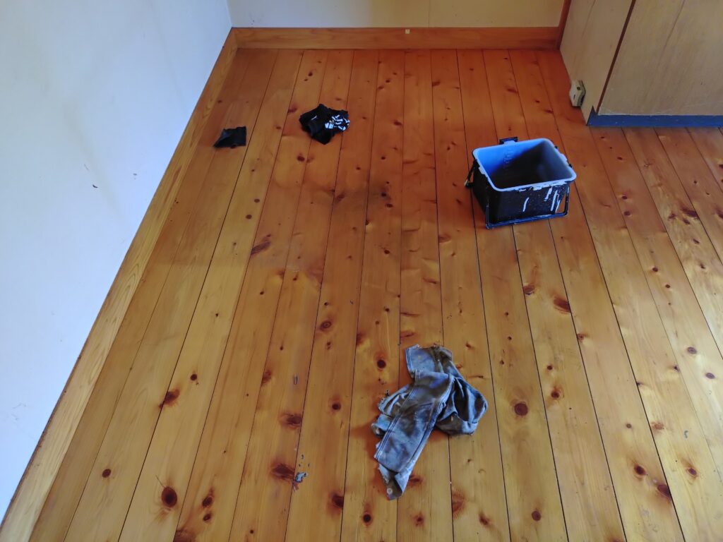 床の塗装をする前に汚れ取りとペーパー掛けをしているところです。