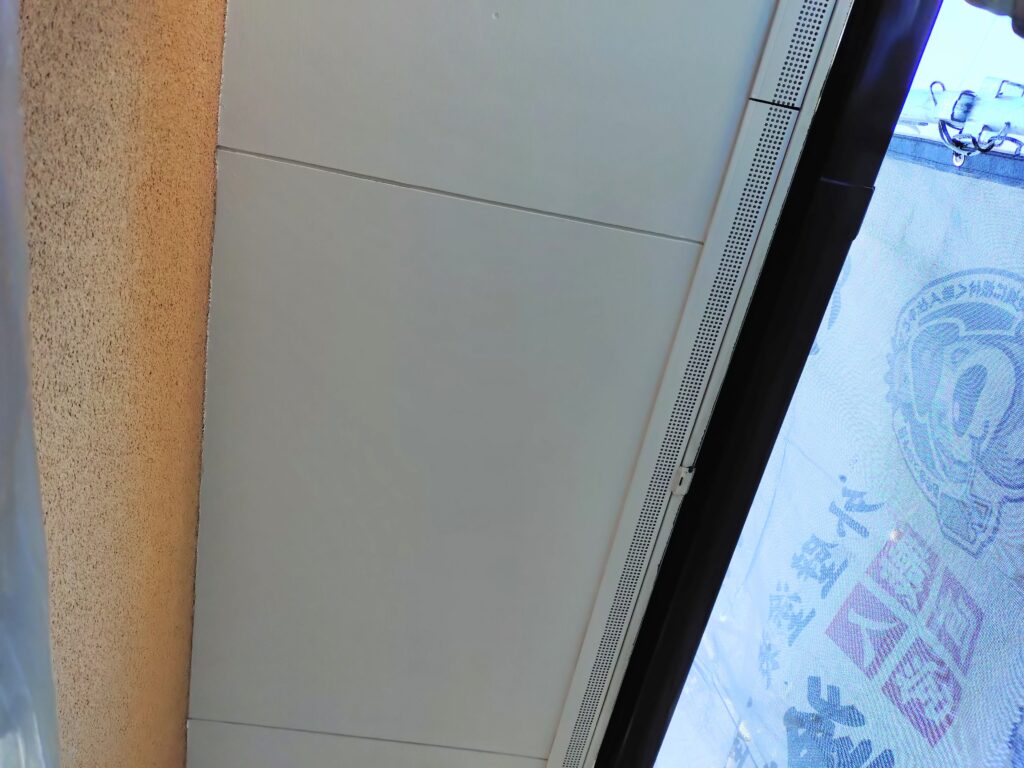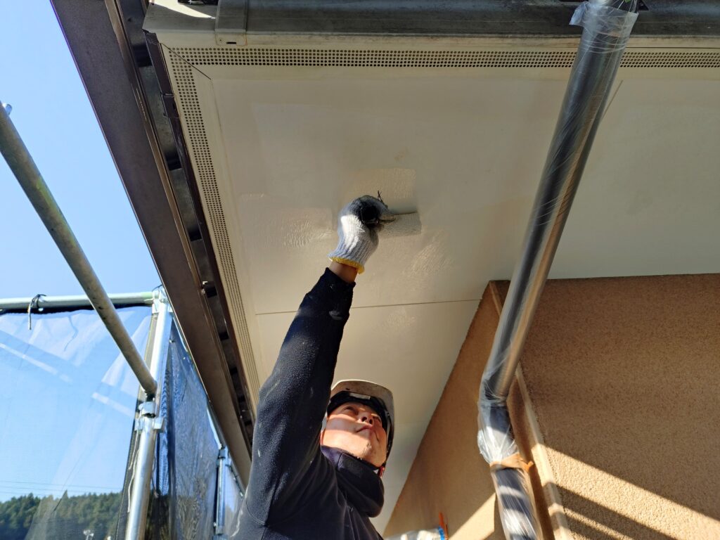 軒天井を塗装するにあたり、風通しや日当たりが悪い面は、湿気も多く通気性が良くないためカビや汚れが付着しやすいため防カビ塗料を塗装しました。