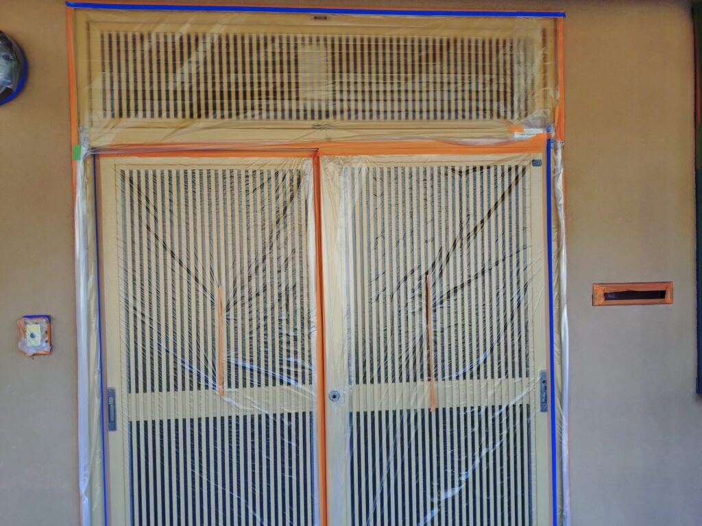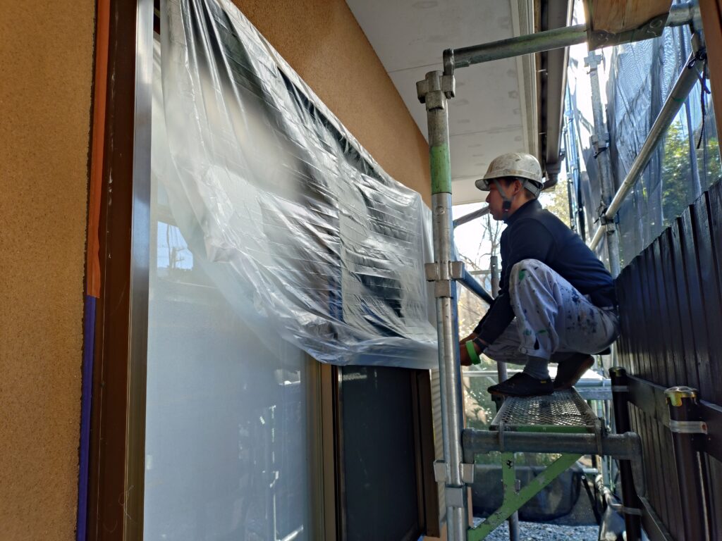 養生は、塗装作業に入る前に塗料がついてほしくない部分(窓や基礎など)や塗料が飛散したり汚れたりするのを防ぎビニールテープやマスキングテープなどで覆い保護する作業のことです。